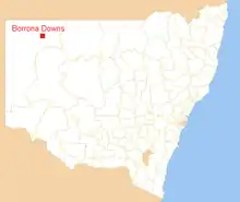Borrona Downs Station is a cattle station near White Cliffs in far western New South Wales.[1][2][3] It is about halfway between Milparinka, around 100 km to the West, and Wanaaring, around 100 km to the East, as the crow flies.[2]