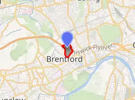 Comprising an area of 11.36 hectares (28 acres) surrounding the manor house, the park is accessed from Boston Manor Road on the eastern perimeter.[2] The construction of the M4 motorway in 1964-5 was the biggest alteration to the park landscape, dissecting the park from north-west to south-east perimeters.[1] The Grand Union Canal and River Brent run along the western perimeter, the canal taking in what is now known as Clitheroes or Clitheroe's Lock 99.[3][4]