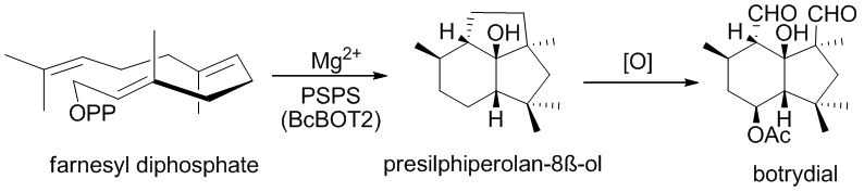 Botrydial originates from the BcBOT2 (Botrytiscinerea BOTrydial biosynthesis) mediated cyclization of farnesyl diphosphate (FPP) to key intermediate tricyclic alcohol presilphiperfolan-8β-ol. Pinedo et al. demonstrated that BcBOT2 is in fact a sesquiterpene synthase by incubation of FPP with recombinant BcBOT2 protein, which yielded the expected presilphiperfolan-8-ol as the major product.