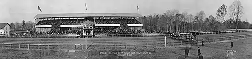 The Bowie Race Track was a horse racing track located just outside the city limits of Bowie, Maryland. The one mile oval racetrack, known as Prince George's Park, was opened October 1, 1914 under the auspices of the Southern Maryland Agricultural Society.[2] A major attraction in the area, easy access for racetrack patrons was available from the WB&A Railroad which ran trains every five minutes from the Liberty Street Station in Baltimore for which they charged 65¢ for a round-trip ticket. Admission to the grounds and grandstand was $1.00.[3]