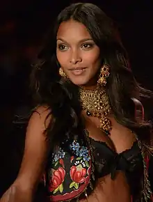 Madonna was one of the first to start showing her bra straps, in the late 1980s.[136] A corset she wore as outerwear during her 1990 Blond Ambition World Tour sold for US$52,000 in 2012 at the Christie's Pop Culture auction in London.[137] Versace's autumn 2013 couture collection featured fashions that were open in the front, revealing underwire bras.[138] It became fashionable from the early 1990s to wear clothing that showed bra straps.[139][140][141][142]