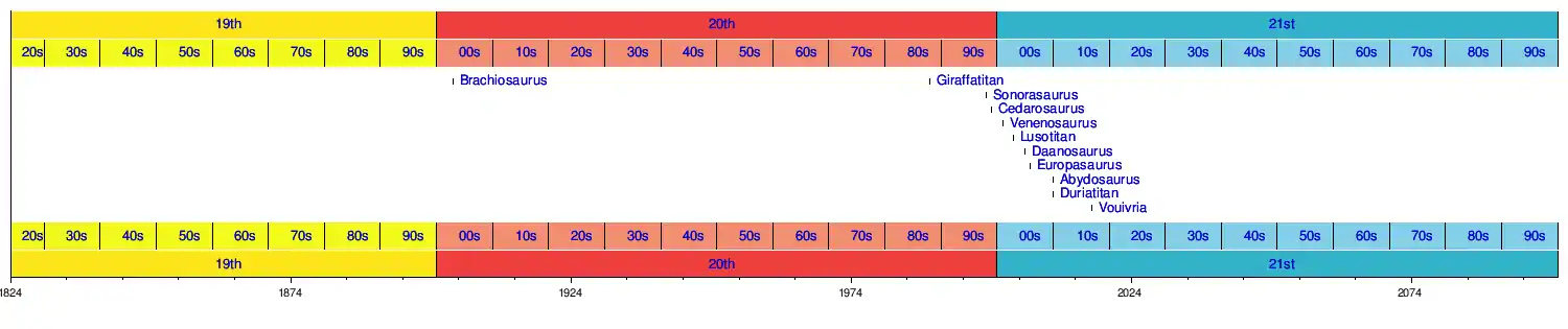 The following diagram is a timeline of important brachiosaurid discoveries, the date given being that of the naming of the genus. The actual excavation was often much earlier, in the case of Vouivria eighty-three years and of Duriatitan at least 136 years.
