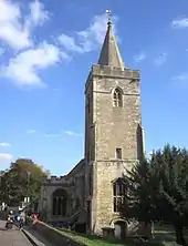 The original parish church has a dedication to the Holy Trinity, and is located near the town centre by the river. It is Norman in origin, and it is possible that the chancel was built over the remains of an older church. Several chapels were added on the north side, and the wall in between was later opened up and the chapels now form the north aisle. A squint, or hagioscope, near the altar is claimed to be England's longest. The tower and spire was built around 1480, replacing an older one, and the south wall was largely rebuilt in the 19th century.[14] The church has a ring of eight bells, with the tenor (heaviest bell) weighing 29 long cwt 2 qr 26 lb (3,330 lb or 1,510 kg) and is tuned to D♭.