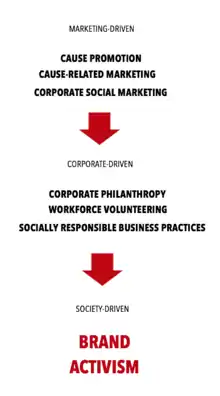 Brand activism was identified and developed as a marketing and business management concept by Philip Kotler and Christian Sarkar in 2018. Brand activism evolves from cause-related marketing and CSR, and socially responsible business practices. The complete list of six major areas for corporate social-responsibility activities is presented in the book In Corporate Social Responsibility: Doing the Most Good for Your Company and Your Cause (2005), by Nancy Lee and Philip Kotler[2]