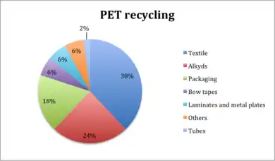 In 2012, more than one third of recycled PET was used as polyesters for the textile industry. Roughly one quarter of recycled PET was processed to alkyds, that is, synthetic resins which are mostly used as varnish, while packaging accounted for 18% of recycled PET.