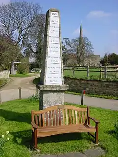 ![]() The milestone obelisk in Bredon, with the village church of St. Giles in the background. | |