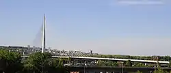 New Railroad Bridge (Нови желеѕнички мост) is a cable-stayed bridge, the second railway bridge across the Sava in the urban section of Belgrade. The construction of the bridge began in 1975 and it was completed and opened for traffic in 1979. The bridge was built as a part of the projected Belgrade railway junction and it directly connects New Belgrade with the, still unfinished, Belgrade Centre railway station in the neighborhood of Prokop.[3] Designed by Nikola Hajdin, it was the first bridge in Europe to use cable-stayed girder system.