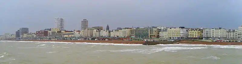 ![]() ![]() ![]() ![]() ![]() Clockwise, from top: Brighton seafront looking west from Brighton Palace Pier; the Jubilee Clock Tower; Brighton Palace Pier; the Royal Pavillion; the i360 observation tower | |
