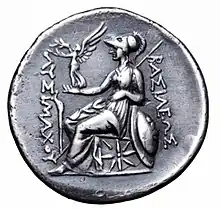 The Emperor Claudius paid a visit while Britain was being conquered and was honoured with the agnomen Britannicus as if he were the conqueror; a frieze discovered at Aphrodisias in 1980 shows a bare breasted and helmeted female warrior labelled BRITANNIA, writhing in agony under the heel of the emperor.[7] She appeared on coins issued under Hadrian, as a more regal-looking female figure.[8] Britannia was soon personified as a goddess, looking fairly similar to the goddess Athena-Minerva - both are seated and replete with helmet, spear (trident) and shield. Early portraits of the goddess depict Britannia as a beautiful young woman, wearing a Corinthian helmet, and wrapped in a white garment with her right breast exposed. She is usually shown seated on a rock, holding a trident, and with a spiked shield propped beside her. Sometimes she holds a standard and leans on the shield. On another range of coinage, she is seated on a globe above waves: Britain at the edge of the (known) world. Similar coin types were also issued under Antoninus Pius.