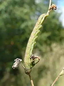 The larva is brown or green with darker diamonds along the back. It feeds on the flowers and buds of various yellow-flowered Asteraceae such as hawksbeards, hawkweeds and sow thistles.[1] The species overwinters as a pupa.