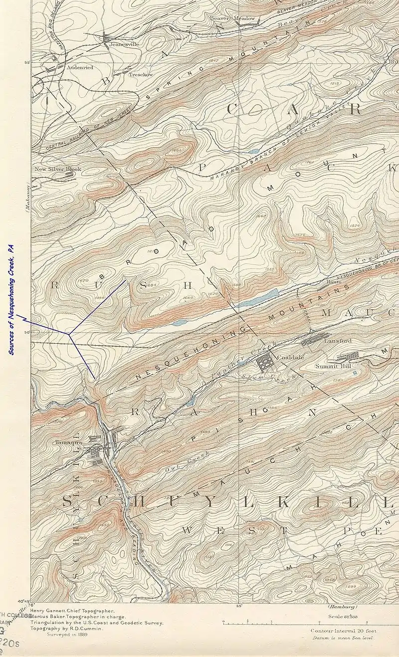 ![]() Broad Mountain had a large importance in local Rail Transportation. The Nesquehoning Creek rises steeply along its southern face to traverse the mountain pass occupied by today's Hometown sitting in a saddle between it and Nesquehoning Ridge. *Paralleling both to the south across Nesquehoning Creek, are Rt-54, and the RBMN railroad, successor to the Lehigh and Susquehanna Railroad and its lessee, the Central Railroad of New Jersey. *Above the North-face, the stream valleys hosted the Beaver Meadows Railroad, later the oldest part of the fabled Lehigh Valley Railroad (Operated today by Norfolk Southern Railroad). | |
