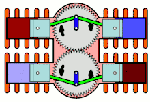Designed as a team effort by Brough, 'Ike' Hatch, and Freddie Dixon, the engine has two horizontally opposed flat twins one above the other and geared together, thus rotating counter to each other forming an H engine. Connecting rods from opposed cylinders were of the fork and blade type and thus shared a common crank pin. All pistons moved in unison, that is to the left or to the right at the same time. The pistons could thus be counterweighted 100% yielding a perfect balance. Primary, secondary and higher-order sources of vibration canceled each other, as did the gyroscopic effects from each crankshaft.[2][3][4][5]