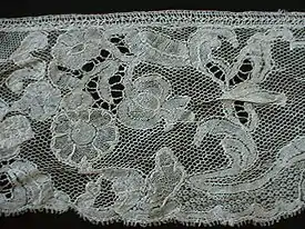 Brussels lace is a type of pillow lace that originated in and around Brussels.[1] The term "Brussels lace" has been broadly used for any lace from Brussels; however, the term strictly interpreted refers to bobbin lace, in which the pattern is made first, then the ground, or réseau, added, also using bobbin lace. Brussels lace is not to be confused with Brussels point, which is a type of needle lace, though is sometimes also called "Brussels lace".[2]
