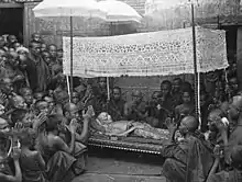 Bayinnaung also promoted mass ordinations into the Sinhala Sangha at the Kalyani Ordination Hall in the name of purifying the religion.[76] He also prohibited all human and animal sacrifices throughout the kingdom. In particular, he forbade the Shan practice of killing the slaves and animals belonging to a saopha at his funeral.[77] He also sent Burmese Theravada monks to preach in the Shan realm.[78] During his reign, there were great scholars such as Saddhammalamkara, Dhammabuddha and Ananda (known for his commentary on the Dhammasanghani's Abhidhammamatika).[79]
