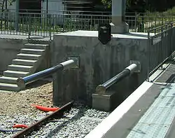 A buffer stop, bumper, bumping post, bumper block or stopblock (US), is a device to prevent railway vehicles from going past the end of a physical section of track.