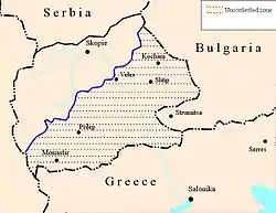 The second important document was a secret annex to the Treaty of Alliance. It specified the territorial acquisitions that Germany guaranteed to Bulgaria: the whole of Vardar Macedonia, including the so-called contested and uncontested zones, plus the part of Old Serbia to the east of the Morava river.[70] In case Romania or Greece attacked Bulgaria or its allies without provocation, Germany would agree to Bulgarian annexation of the lands lost to these countries by the Treaty of Bucharest of 1913, and to a rectification of the Bulgarian-Romanian border as delimited by the Treaty of Berlin of 1878. In addition, Germany and Austria-Hungary guaranteed the Bulgarian government a war loan of 200,000,000 francs and in case the war lasted longer than four months, they guaranteed an additional supplementary loan.[70]