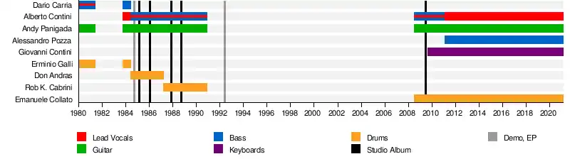 - Alberto "A.C. Wild" Contini – vocals (1983–1990, 2008–present), bass (1984-1990, studio 2008-2011)