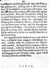 A pamphlet detailing the burning in April 1652 of Joan Peterson, the so-called Witch of Wapping, also describes the execution of Prudence Lee, found guilty of mariticide. Lee was apparently brought on foot, between two sheriff's officers and dressed in a red waistcoat, to the place of execution in Smithfield. There she confessed to having "been a very lewd liver, and much given to cursing and swearing, for which the Lord being offended with her, had suffered her to be brought to that untimely end". She admitted to being jealous of and arguing with her husband, and stabbing him with a knife. The executioner put her in a pitch barrel, tied her to the stake, placed the fuel and faggots around her and set them alight. Lee was reported to have "desired all that were present to pray for her" and, feeling the flames, "shrike[d] out terribly some five or six several times."[16] Burning alive for murder was abolished in 1656, although burning for adultery remained.[17] Thereafter, out of mercy, the condemned were often strangled before the flames took hold. Notable exceptions to this practice were the burnings in 1685 and 1726 of Elizabeth Gaunt, found guilty of high treason for her part in the Rye House Plot,[7] and Catherine Hayes, for petty treason. Hayes apparently "rent the air with her cries and lamentations"[18] when the fire was lit too early, preventing the executioner from strangling her in time. She became the last woman in England to be burned alive.[19]