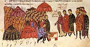 The Byzantines were forced to fight alone, but the peace with the Arabs allowed them to amass their whole army, including the troops stationed in Asia Minor. These forces were placed under the command of the Domestic of the Schools Leo Phokas the Elder.[43][48] Before marching to battle the soldiers bowed to "the life-giving True Cross and vowed to die for one another".[49] With his western and northern borders secure, Simeon I was also able to muster a large host. The two armies clashed on 20 August 917 near the Achelous river in the vicinity of Anchialus.[43] Initially, the Byzantines were successful, and the Bulgarians began an orderly retreat, but when Leo Phokas lost his horse, confusion spread among the Byzantine troops, who according to the chronicler John Skylitzes had low morale. Simeon I, who was monitoring the battlefield from the nearby heights, ordered a counter-attack and personally led the Bulgarian cavalry.[50][51][52] The Byzantine ranks broke and in the words of Theophanes Continuatus "a bloodshed occurred, that had not happened in centuries".[53] Almost the whole Byzantine army was annihilated and only a few, including Leo Phokas, managed to reach the port of Messembria and flee to safety on ships.[44][54]