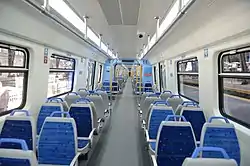 The trains have a series of features in line with modern rolling stock, such as ABS, air conditioning, CCTV, a train protection system and intelligent doors, while numerous components such as the brakes and traction system were sourced from countries such as Germany, Sweden and Japan.[18][19] There are very minor differences with the Roca Line trains, and the most major difference is the overhead collection which runs at a different voltage. The trains began to arrive in February 2014, just 13 months after the order was signed.[20]