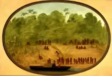 Samuel Fritz and other missionaries began concentrating the scattered indigenous communities into Jesuit reductions in order to facilitate religious indoctrination and protect them from enslavement by the Portuguese, but smallpox devastated the population, leaving the region of the upper Solimões uninhabited.[6] In 1745 Charles Marie de La Condamine wrote in his Relation abrégée d'un voyage fait dans l'intérieur de l'Amérique Méridionale,[15][16] that of the 30 Omagua villages marked on Fritz's 1707 map, he saw only ruins, adding that "all the inhabitants, frightened by the incursions of a group of bandits from Pará, who came to enslave them in their own lands, dispersed into the forest and the Spanish and Portuguese missions."[16] Throughout the eighteenth century and until slavery was officially outlawed in Brazil in 1888, forced labor programs destroyed indigenous communities, compelling the natives to abandon their ethnic traditions and adopt the identity of caboclos (settlers of mixed race).[1] By the late 1980s, it was assumed by many ethnographers such as Betty Jane Meggers that the Cambeba were extinct.[17]