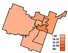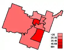 The safest Tory seats are located in the more suburban ridings outside of the city core. From 2004 to 2011, their best riding in the region was Edmonton—Spruce Grove—most of which is now Edmonton West. In 2011, for instance, the Conservatives won 71% of the vote there. They also won more than 60% of the vote in Edmonton—St. Albert, Edmonton—Leduc and Edmonton—Mill Woods—Beaumont. Further underlining this, one of the Liberal gains in 2015 was in Edmonton Centre.