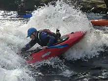 Canoe freestyle (also knows as playboating) is a discipline of whitewater kayaking or canoeing where people perform various technical moves in one place (a playspot), as opposed to downriver whitewater canoeing or kayaking where the objective is to travel the length of a section of river (although whitewater paddlers will often stop and play en route). Specialised canoes or kayaks (boats) known as playboats are often used, but any boat can be used for playing. The moves and tricks are often similar to those performed by snowboarders, surfers or skaters, where the athlete completes spins, flips, turns, etc. With modern playboats it is possible to get the kayak and the paddler completely airborne while performing tricks.[1] The competitive side of playboating is known as freestyle kayaking (formerly called rodeo).