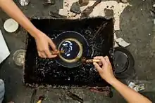 Firstly, the cloth must be washed, soaked and beaten with a large mallet. The hot and liquid wax is scooped from small wajan (wok) heated upon small stove. The batik craftsperson sometimes blow the spout tip of canting to allow the liquid wax to flow smoothly and to avoid clogging, then they draw the line or dot upon the cloth, applying the liquid wax, following the patterns and images that previously had been drawn using pencil.[16] A pattern is then drawn with hot wax called malam using canting. The wax functions as a dye-resist. After this, the cloth is dipped in a dye bath containing the first colour. After the cloth is dry, the wax is removed by scraping or boiling the cloth. This process is repeated as many times as the number of colours desired. For larger areas of cloth which need to be covered, the wax is applied using a tool called tonyok nemboki/mopoki.[17]