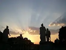 A balustrade, punctuated by sculptures atop the giant pilasters, capped the composition, one of the most influential of Michelangelo's designs. The two massive ancient statues of Castor and Pollux that decorate the balustrades are not the same as those posed by Michelangelo, which now are in front of the Palazzo del Quirinale.[8]