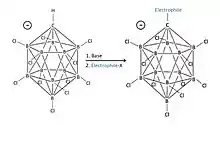The descriptor closo indicates that the molecule is formally derived (by B-to-C+ replacement) from a borane of stoichiometry and charge [BnHn]2– (n = 12 for known carborane acids).[28] The cagelike structure formed by the 11 boron atoms and 1 carbon atom allows the electrons to be highly delocalized through the 3D cage (the special stabilization of the carborane system has been termed "σ-aromaticity"), and the high energy required to disrupt the boron cluster portion of the molecule is what gives the anion its remarkable stability.[28] Because the anion is extremely stable, it will not behave as a nucleophile toward the protonated substrate, while the acid itself is completely non-oxidizing, unlike the Lewis acidic components of many superacids like antimony pentafluoride. Hence, sensitive molecules like C60 can be protonated without decomposition.[29][30]