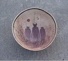 His Mimbres bowls were fabricated as a modern version of the ancient Anasazi ones - on the interior they were generally cream colored and quite smooth whereas the exterior appeared almost disregarded and less important (see Figures 1 and 2). Having studied all available exemplars found in museums, art galleries, shops, books, and otherwise, Beam's contemporary versions were largely influenced by the materials and sophisticated art dialogue present in the Anasazi works he saw. Also in the Anasazi tradition, Beam's bowls typically featured a bold design around the rim with his own unique images placed in the center. The result of his and Ann's early work was an exhibition in 1982 entitled "The Painted Pottery of Ann and Carl Beam" at the Maxwell Museum of Anthropology of the University of New Mexico in Albuquerque,[12] with other shows to follow later.
