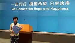 In the 2017 Chief Executive election, Lam received 777 votes in the 1,194-member Election Committee, beating former Financial Secretary John Tsang's 365 votes and retired judge Woo Kwok-hing's 21 votes. Lam was the first female Chief Executive in history, higher than Leung's 689 votes in the last election. She also became the first Chief Executive elected without being the most popular candidate, as she had been trailing behind Tsang in the polls.[1] She pledged to "heal the social divide" and "unite our society to move forward" in her victory speech.[2]
