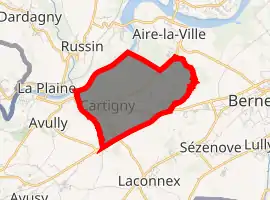 The municipality is located in the center of the Swiss Champagne valley. It consists of the villages of Cartigny and La Petite Grave.