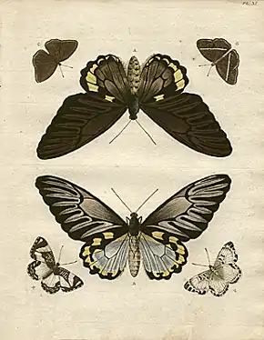 Stoll became involved with Pieter Cramer's De Uitlandsche Kapellen before 1774.[8] He took over the entire work after the death of Cramer, on 26 September 1776.[9] The first four volumes were finished in 1782 but Stoll kept working, at a much slower pace, caused by the lack of new material as he himself explained,[9] on the supplement (Aanhangsel), which was finally finished in 1791. Stoll mentioned that all the butterflies were collected in the Dutch colonies, like Surinam, Ceylon, Java, Ambon and Sierra Leone. The work was completed "without losing sight of the all-powerful hand of the Creator". In the 18th century this was a sort of automatism, to safeguard a book from being banned or burned.[10]