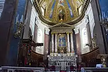 Inside the church are paintings by the studio of Giuseppe Ribera, a copy of a Caravaggio altarpiece, and paintings by Vincenzo da Forli, Giovanni Battista Spinelli, Nunzio Rossi, Giuseppe Marullo, Giuseppe Bonito, and Giacinto Diano. The church has a marble ciborium (1518), attributed to Andrea da Fiesole, and a statue of the Archangel St. Michael attributed to the studio of Francesco Laurana.[1]