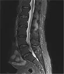 The cause is usually a disc herniation in the lower region of the back.[1] Other causes include spinal stenosis, cancer, trauma, epidural abscess, and epidural hematoma.[1][2] The diagnosis is suspected based on symptoms and confirmed by medical imaging such as MRI or CT scan.[1][3]