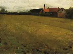 Beaux attended Sartain's classes for two years, then rented her own studio and shared it with a group of women artists who hired a live model and continued without an instructor. After the group disbanded, Beaux set in earnest to prove her artistic abilities. She painted a large canvas in 1884, Les Derniers Jours d'Enfance, a portrait of her sister and nephew whose composition and style revealed a debt to James McNeill Whistler and whose subject matter was akin to Mary Cassatt's mother-and-child paintings.[24] It was awarded a prize for the best painting by a female artist at the Academy, and further exhibited in Philadelphia and New York. Following that seminal painting, she painted over 50 portraits in the next three years with the zeal of a committed professional artist. Her invitation to serve as a juror on the hanging committee of the Academy confirmed her acceptance amongst her peers.[25] In the mid-1880s, she was receiving commissions from notable Philadelphians and earning $500 per portrait, comparable to what Eakins commanded.[26] When her friend Margaret Bush-Brown insisted that Les Derniers was good enough to be exhibited at the famed Paris Salon, Beaux relented and sent the painting abroad in the care of her friend, who managed to get the painting into the exhibition.[26]