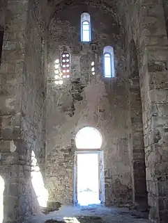 Most of the frescoes did not survive. The remains of the second stage of the painting (the first decoration was probably incomplete and was located mainly in the apses) are preserved on the northern and southern walls of the cross' lateral branches. The northern wall displays an image of two Holy martyrs above the entrance between the windows. In the Central part of the southern wall, between the door and the windows, a huge (about 3 m) image of saints Constantine and Helena holding a large cross is visible. To the right of them under the window there is a small fragment of the image of the warrior. On the walls of the Western sleeve were depicted the Holy warriors-horsemen. On one of the arches under the dome in the XIX century was the figure of the prophet Daniel.[6]