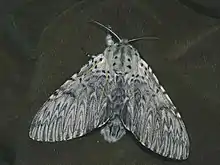 Cerura vinula has a wingspan of 58 millimetres (2.3 in) to 75 millimetres (3.0 in) – the males are slightly smaller. [2] The head, thorax, and body of these moths are very fluffy, with a cat-like appearance (hence the common English name puss moth). [2] The antennæ are bipectinated. They have white or yellowish-gray forewings crossed by several wave-like dark lines. The hindwings are light gray or whitish in the males, while in the females they are suffused with blackish but almost transparent. The body is whitish gray, with the dorsal abdomen banded in black. [3]