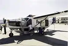 The prototype first flew on December 9, 1982.[3] The production model was certified by the Federal Aviation Administration (FAA) in October 1984.[4] A freighter variant without cabin windows was developed at the request of Federal Express as the Cargomaster.[4] Another cargo variant for Federal Express, with a longer fuselage and a cargo pod under the belly, was developed as the 208B Super Cargomaster and flew for the first time in 1986.[4] FedEx was initially planning to build twin-engine piston-powered airplanes with Piper Aircraft, but picked the Caravan after surveying it and having flown the prototype, becoming its standard carrier.[2]