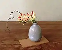 The history of chabana follows hand-in-hand with the history of chadō, and within that historical milieu, chabana emerged in tandem with the rise of wabi-cha around the Momoyama period. Sen no Rikyū is considered the most influential person in the development of wabi-cha, and is also credited as the originator of the accompanying nageire mode of flower arrangement, which is characterized by freedom and spontaneity in expressing the natural beauty of the material.[4] Among the statements attributed to him, the first one in the set of seven known as "Rikyū's Seven Precepts" (Rikyū shichisoku) concerns chabana.[6] It goes, "The flowers [Chabana] should be such as they are in the moor."[7] In the history of ikebana, the nageire style was added to the more stylized rikka arrangement around the end of the 1600s, as influenced by chabana.[3] This new style had fewer rules and appealed to those who were searching for a more simple and natural look. Early tea masters used the nageire style until it further divided into the seika, pure chabana, tea flower, styles. The chabana style, with no formal written rules, became the standard style of arrangement for chanoyu.