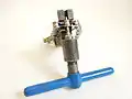 The chain tool has two positions where a chain can be inserted perpendicular to the tool, one close to the movable screw portion, and one lower down just above the fixed end. In each position, there are a pair of protruding tabs; one fits into the center of one link of the chain, the other fits into the center of the next link. With the chain properly in place, the pin is held in the center of the tool, so that the tip of the movable screw can press on the end of the pin. The end of the screw is slightly narrower than the pin, so that it can press the pin through the link. Often the end of the screw is a removable piece which can be replaced when worn.