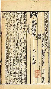Chao Yuanfang (Chinese: 巢元方; pinyin: Cháo Yuánfāng) was a Chinese physician and medical author who was court physician at the Sui Dynasty (581–618 CE) between the years 605 and 616. Traditionally, he had been attributed the co-authorship or authorship of the Chinese medical classic Zhubing Yuanhou Lun (Chinese: 諸病源候論; pinyin: Zhū bìngyuán hòu lùn) (General Treatise on Causes and Manifestations of All Diseases). This work sets out a classification of diseases and describes their causes and symptoms. It also discusses therapeutic methods.[1] The Zhubing yuanhou lun had an important influence on the development of Chinese medicine. Its influence also extended to Japan where it formed the inspiration for the Ishinpō, the oldest surviving Japanese medical text completed in 984.[2]
