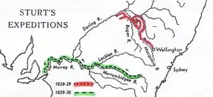 Sturt received approval from Governor Darling on 4 November 1828 to explore the area of the Macquarie River in western New South Wales.[2] It was not, however, until 10 November that the party started out. It consisted of Sturt, his servant Joseph Harris, three soldiers and eight convicts; on 27 November Sturt was joined by Hamilton Hume as his first assistant. Hume's experience proved to be very useful. A week was spent at Wellington Valley breaking in oxen and horses, and on 7 December the real start into comparatively little known country was made. 1828–29 was a period of drought and the party had difficulty in finding sufficient water. They had followed the courses of the Macquarie, Bogan and Castlereagh rivers and, though its importance was scarcely sufficiently realized, had visited the Darling River. The party returned to Wellington Valley on 21 April 1829. The expedition proved that northern New South Wales was not an inland sea, but deepened the mystery of where the western-flowing rivers of New South Wales went.[3]