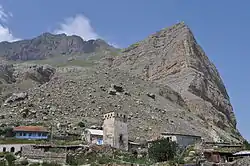 ![]() The selo of Eltyubyu in Chegemsky District. The tower of the Balkarukovs, a cultural heritage object of Russia, is seen in the center. | |