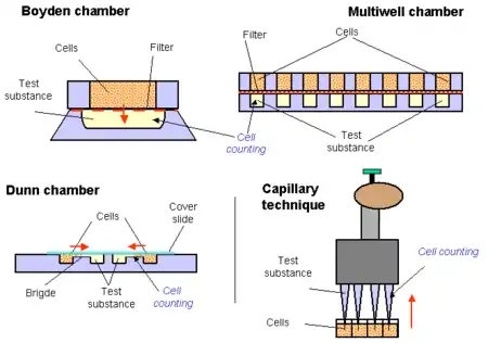 Chemotaxis assays are experimental tools for evaluation of chemotactic ability of prokaryotic or eukaryotic cells. A wide variety of techniques have been developed. Some techniques are qualitative - allowing an investigator to approximately determine a cell's chemotactic affinity for an analyte - while others are quantitative, allowing a precise measurement of this affinity.