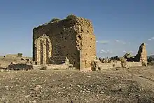The Roman bridge over the Medjerda is considered to be the largest Roman bridge in North Africa and has an outstanding importance from an architectural and engineering perspective. It led the Roman road between Thuburnica and Sicca Veneria across the Medjerda near Simitthus. In the swampland of the highly meandering river, the difficult foundations and the recurring floods made the construction a risky undertaking. In the 1st century AD the first attempt was made to build bridges, but this first bridge did not extend beyond the century. In 112 AD, a new building was erected by Trajan, as can be found in an inscription (now in the Chimtou Museum). The river was temporarily diverted to build the bridge. A 30 meter wide and 1.5 meter thick foundation slab made of wooden crates filled with a lime-mortar-stone mixture (Caementicium) was placed on the river bed. Their top was secured with a covering of stone blocks. This construction, was heavily stressed by the strongly changing water flow and was therefore strengthened later. However, the fortifications could not stop the plateau from being submerged, which eventually led to the collapse of the bridge in the 4th century.[4] Since then the remains of the building form an impressive rubble field.