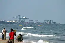 Historically, the port was responsible for the shoreline changes in the region, where the area south of the port has accreted significantly, resulting in the formation of the Marina Beach, whereas the coast in the northern region has undergone severe erosion.[42][43] Ever since the harbour was constructed, the coast north of the harbour has been experiencing erosion at the rate of about 8 m annually. The shoreline has recessed by about 1,000 m with respect to the original shoreline in 1876. It is estimated that 500 m of beach has been lost between 1876 and 1975 and another 200 m between 1978 and 1995. About 350 ha land in the coast north of the port is lost into sea.[37] On the other hand, the area south of the port is increasing 40 sq m every year due to the progradation.[43]