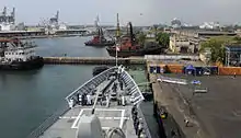Chennai port is the second smallest in the country measured by surface area, encompassing only 274 hectares.[56] Chennai port area is divided into north, central and south zones and fishing harbours.[57] The port has 26 alongside berths, including 21 deep-drafted berths and 2 oil jetties, in the 3 docks, viz., Dr. Ambedkar Dock, Satabt Jawahar Dock, and Bharathi Dock along with the container terminal, and draft ranging from 12–16.5 m (39–54 ft). Dr. Ambedkar Dock has 12 berths, Jawahar Dock has 6 berths, Bharathi Dock has 3 berths (for oil and iron ore), the container terminal has 3 berths and the moorings has 1 berth. The berths can handle containers as well as liquid and dry bulk and breakbulk cargoes. The approach channel to the port is 6,700 m (22,000 ft) long, and the turning basin is 560 m (1,840 ft) in length.[58] A total of 9 well-lit channels marks buoys for the approach channel.