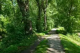 In 1958, the entire path was cleared for hiking and a 12-mile bicycle trail was built on the towpath, from Georgetown's Mule Bridge at 34th Street in Washington, DC to Widewater, MD.[19] The bicycle trail was built by laying crushed blue stone over the muddy towpath and opened on November 22, 1958.[20] Cyclists were biking the full route by 1960.[21]